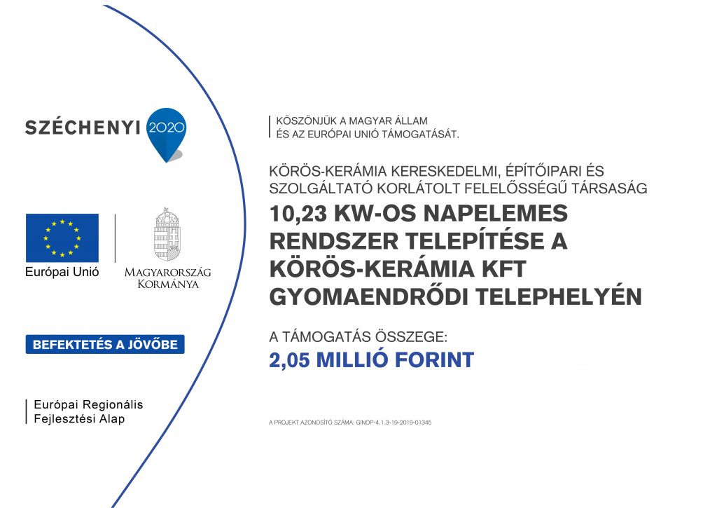 A projektünk keretében a Kőrős-Kerámia Kft. gyomaendrődi telephelyén kívánunk napelemes rendszert kialakítani, amely a telephely éves villamosenergia szükségletét fedezi. A projektünk célja a Vállalkozásunk rezsiköltségének csökkentése, napelemes rendszer kialakítása révén, amely biztosítja a vállalkozásunk telephelyének éves energiaszükségletét, további cél pedig versenyképességünk erősítése és a környezetterhelés csökkentése. A projekt keretében 10,23 kWp teljesítményű rendszer kialakítására kerül sor, telephelyen lévő épület tetőszerkezetén, amely 1 db Fronius Symo 10.0-3M wlan (2MPP) inverterből és 31 db Trina Solar 330Wp DE06M.08(II) (mono, félcellás) napelemből áll.
